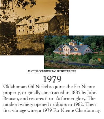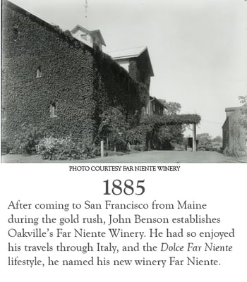 Others were also in place when wine became a growth industry. One was John Benson, who bought 400 acres of Oakville land in 1873 and planted an 84 acre vineyard. In 1876 he made his first wine, 15,000 gallons—and dubbed the estate Far Niente, Italian for “without a care.” In 1885, his great winery was built from plans by H.W. McIntyre, whose other masterpieces would include Inglenook and Greystone (now the West Coast headquarters of the Culinary Institute of America). A wonderfully restored Far Niente still graces the western foothills of Oakville.