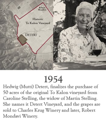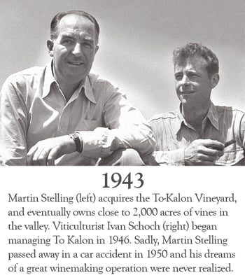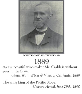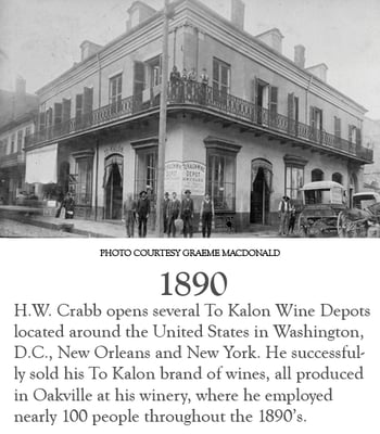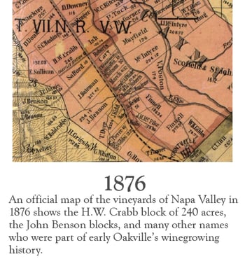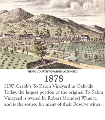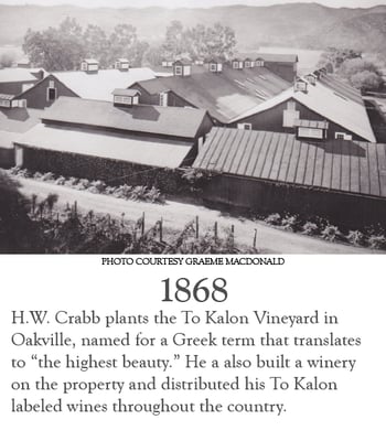 H.W. Crabb was the first man who made Oakville a premium wine district. He came to California in 1853 and settled in San Lorenzo. In 1868, Crabb purchased a 240-acre parcel in Oakville. By 1877, Crabb had 130 acres of the best vines available and was producing 50,000 gallons of wine. He called the place To Kalon, Greek for “most beautiful.” Crabb was solidly in place to enjoy thegreat wine boom that dominated California viticulture after 1879. By 1880, Oakville had become a bustling little village, and there were 430 acres of wine grapes in the area.